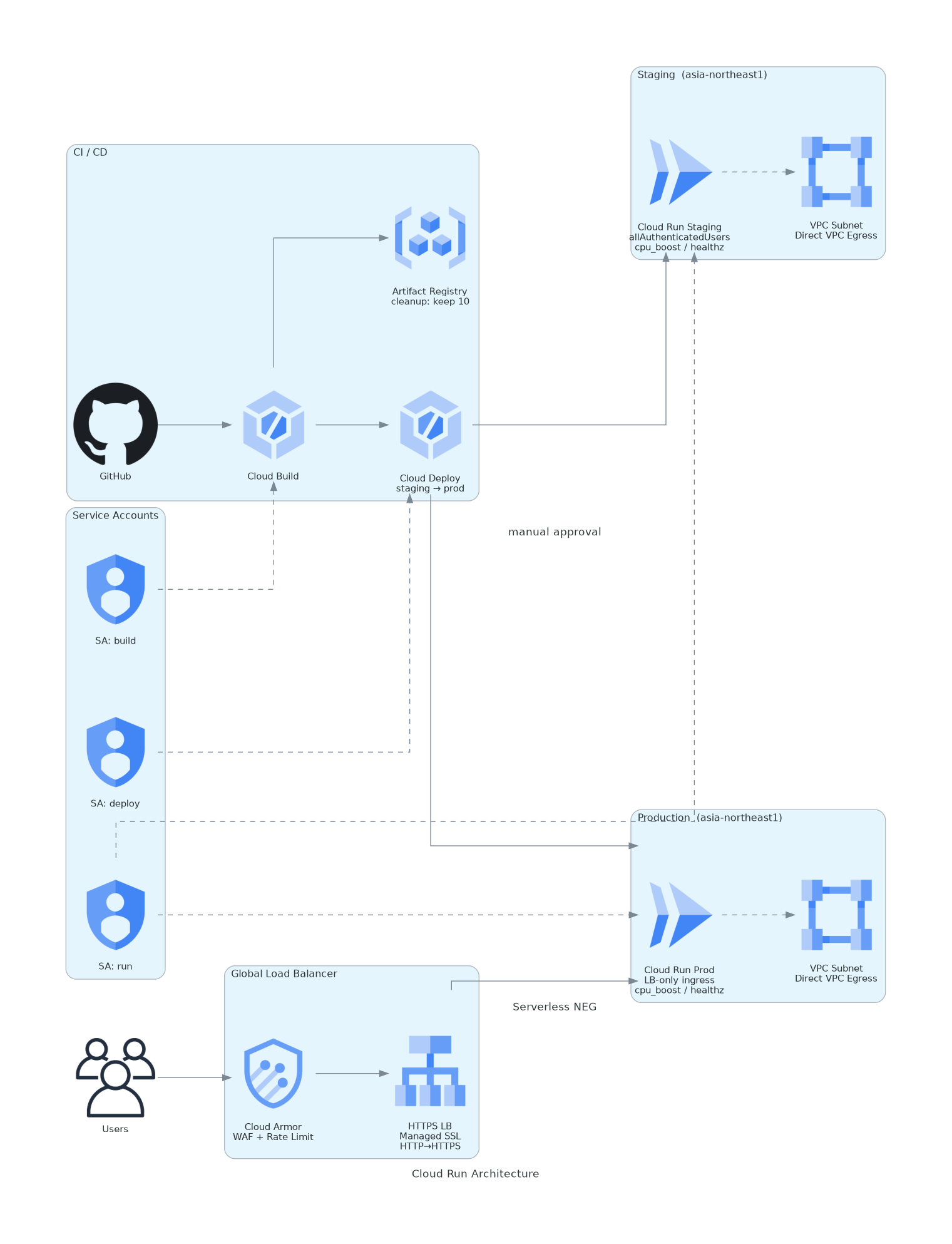 CI/CD の流れとしては、開発者が GitHub にコードを push すると Cloud Build がコンテナイメージをビルドして Artifact Registry に格納し、Cloud Deploy がステージング環境へ自動デプロイします。ステージングでの確認後、手動承認を経て本番環境へプロモートされます。本番の Cloud Run へのアクセスは Load Balancer 経由のみに制限し、Cloud Armor で WAF とレートリミットを適用します。