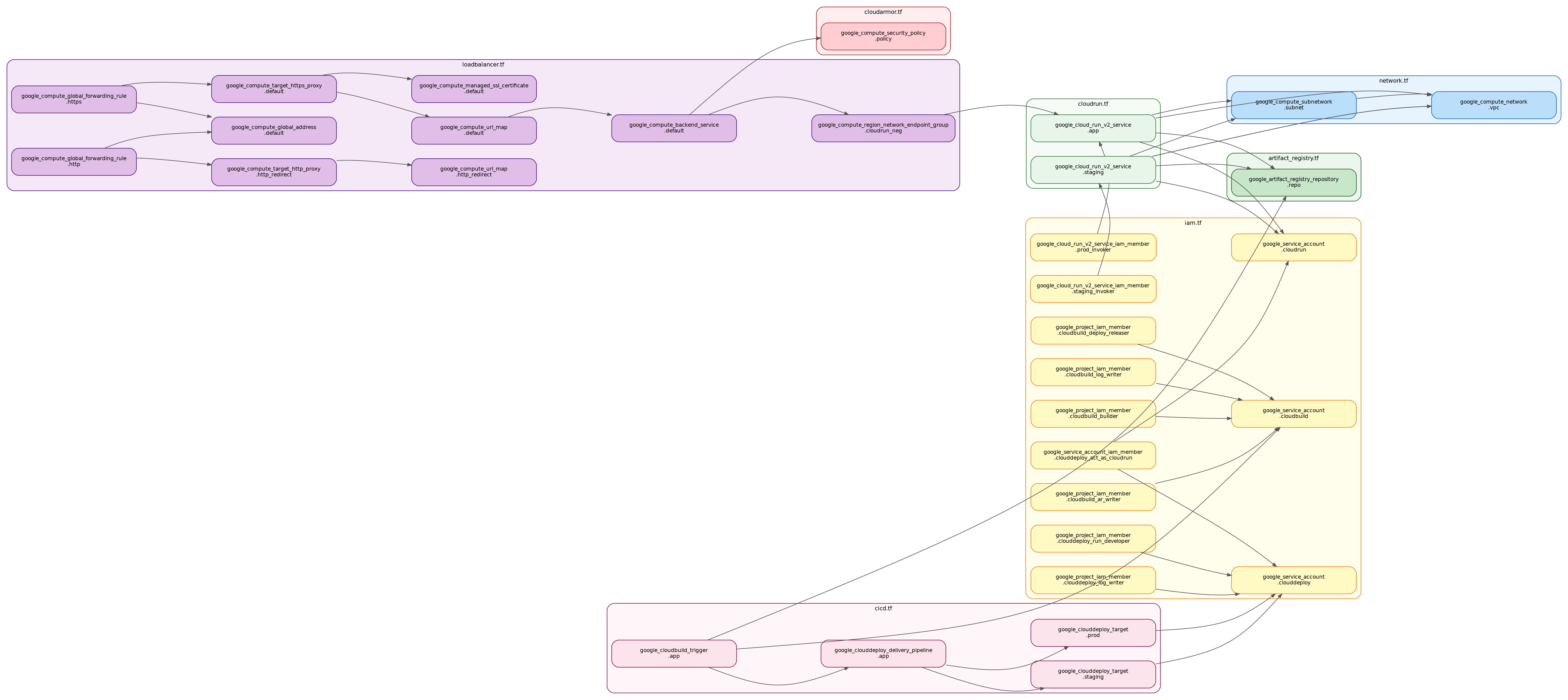 リソース関係図を見ると、google_cloud_run_v2_service・google_clouddeploy_delivery_pipeline・google_cloudbuild_trigger という 3 つの主要リソースがそれぞれ独立したサービスアカウントを持ちつつ、Artifact Registry と VPC を共有していることがわかります。各コンポーネントの責務が明確に分離されており、IAM の最小権限原則が徹底されています。